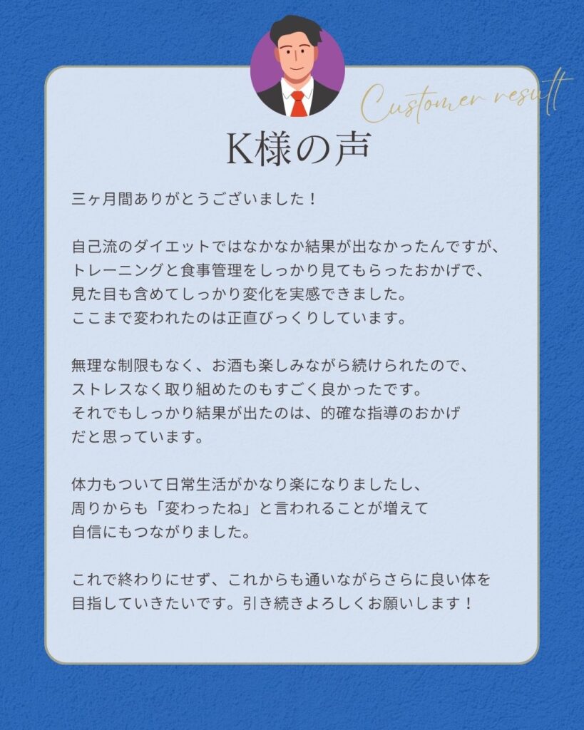 K様は大好きなお酒やお付き合いでの食事がある中でこのような素晴らしすぎる結果を出しました🔥